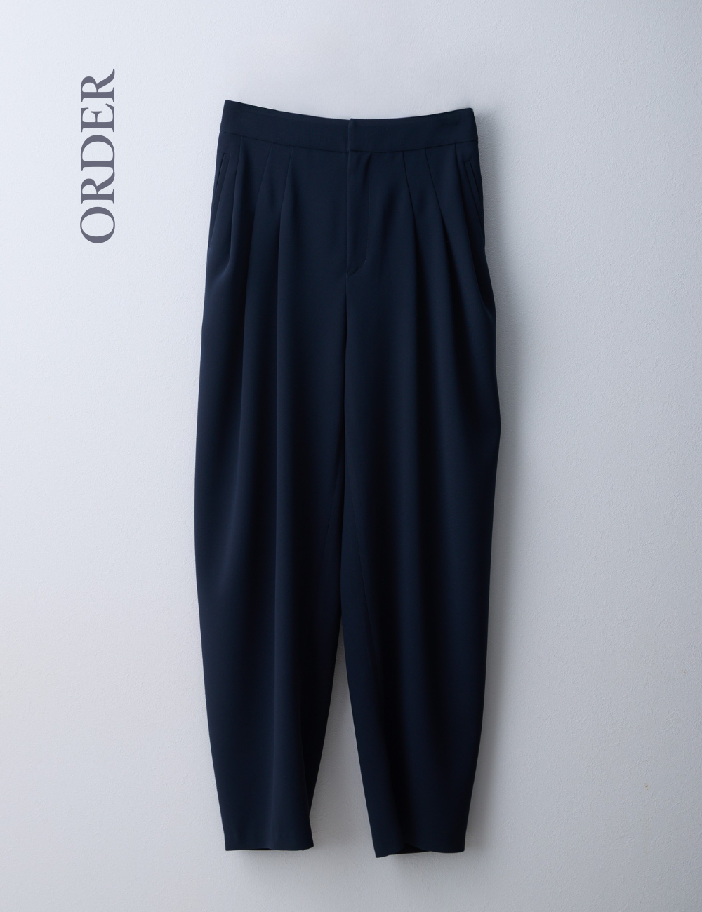 前後に深めのタックを入れ、腰まわりをふわりとカバーしながら、