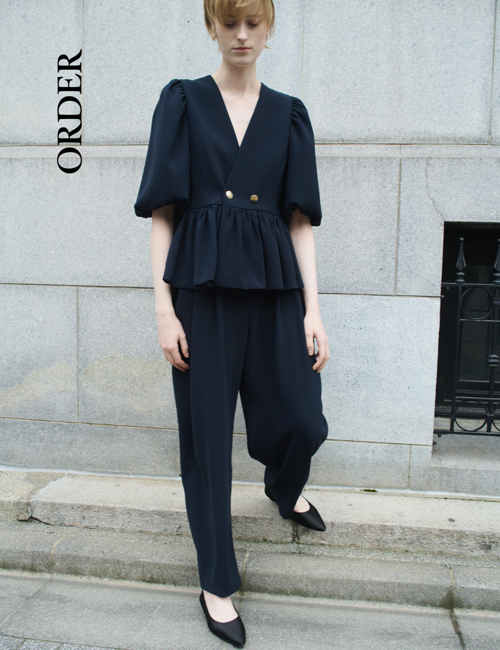 パフスリーブとウエストからたっぷり入ったギャザーが魅力のジャケット。