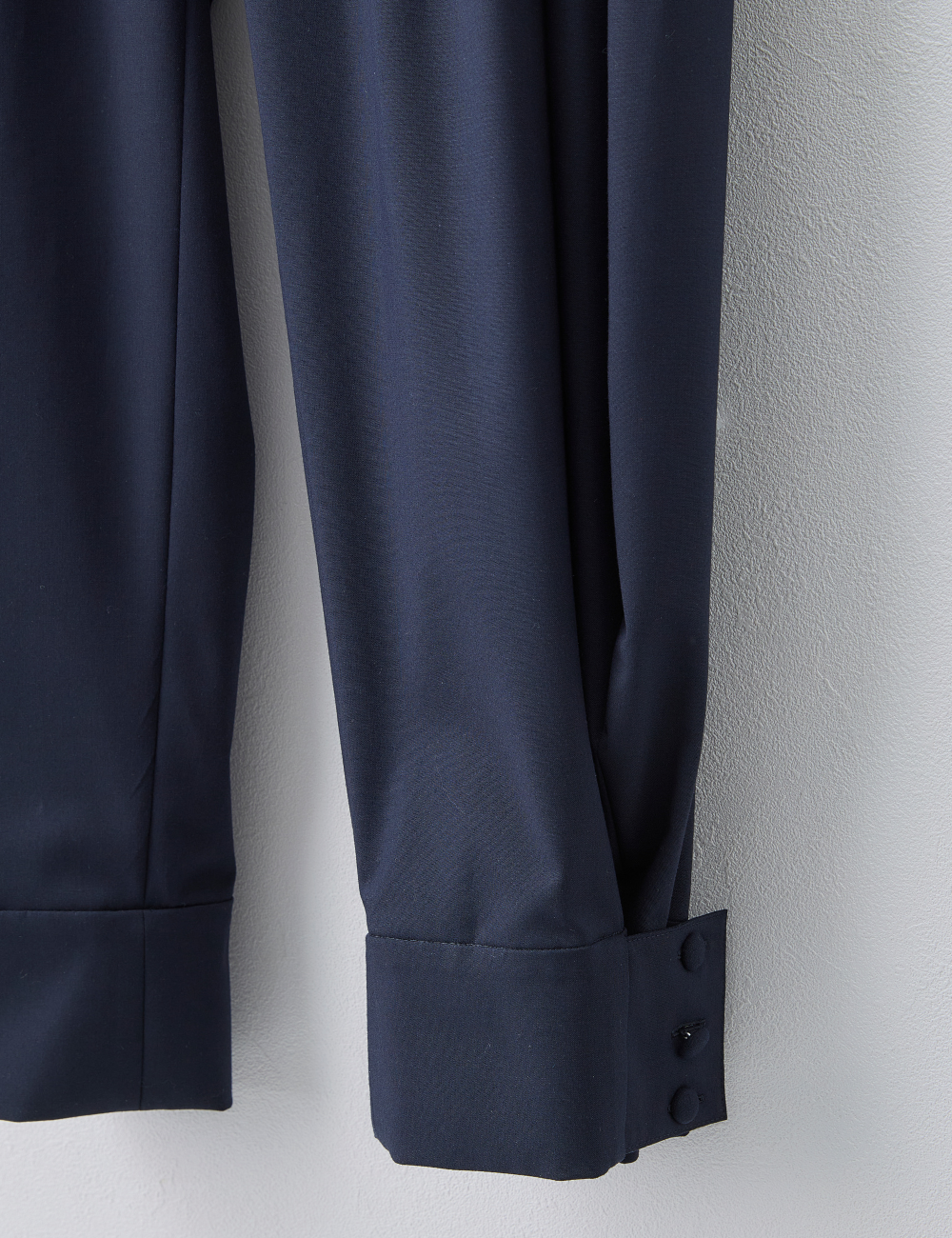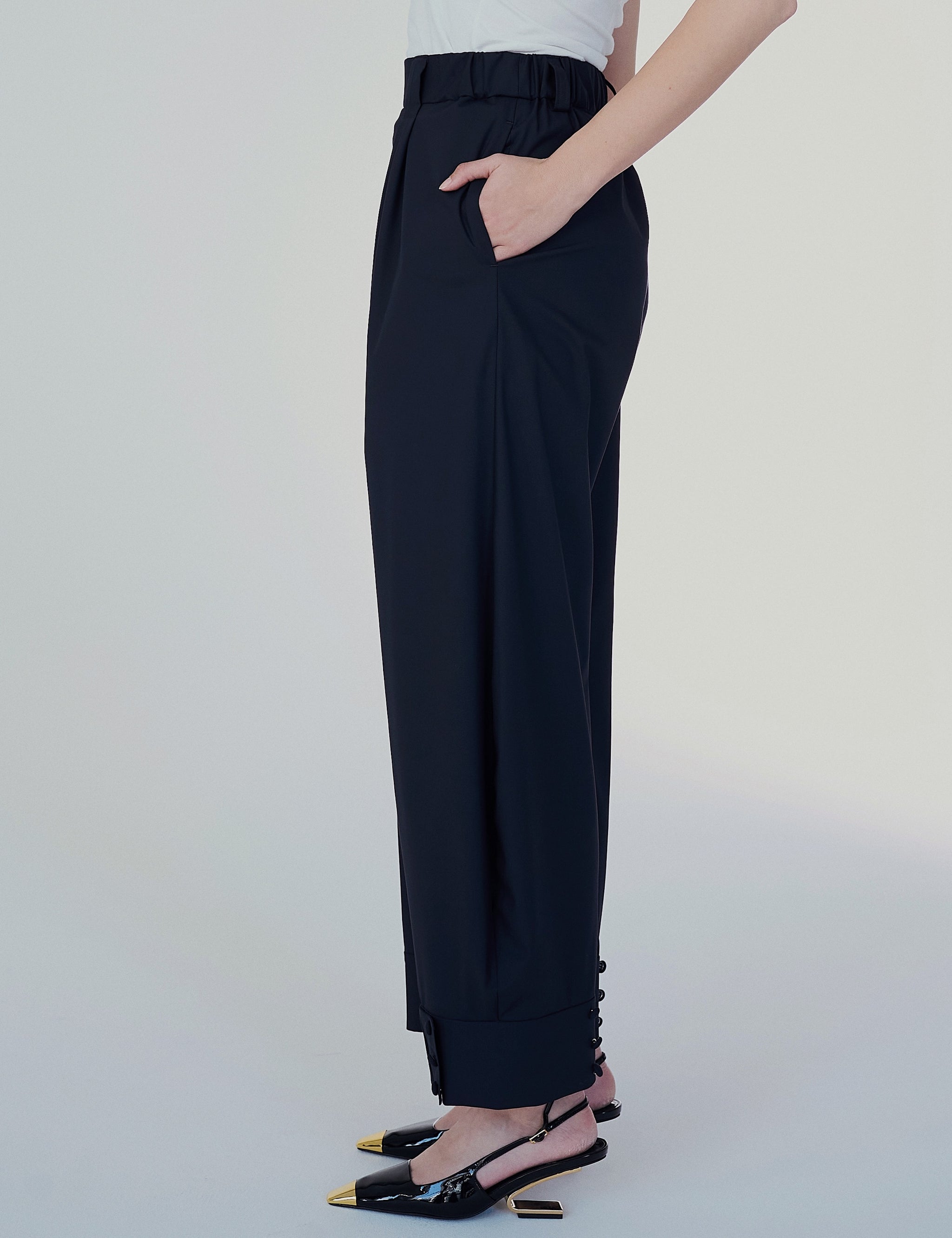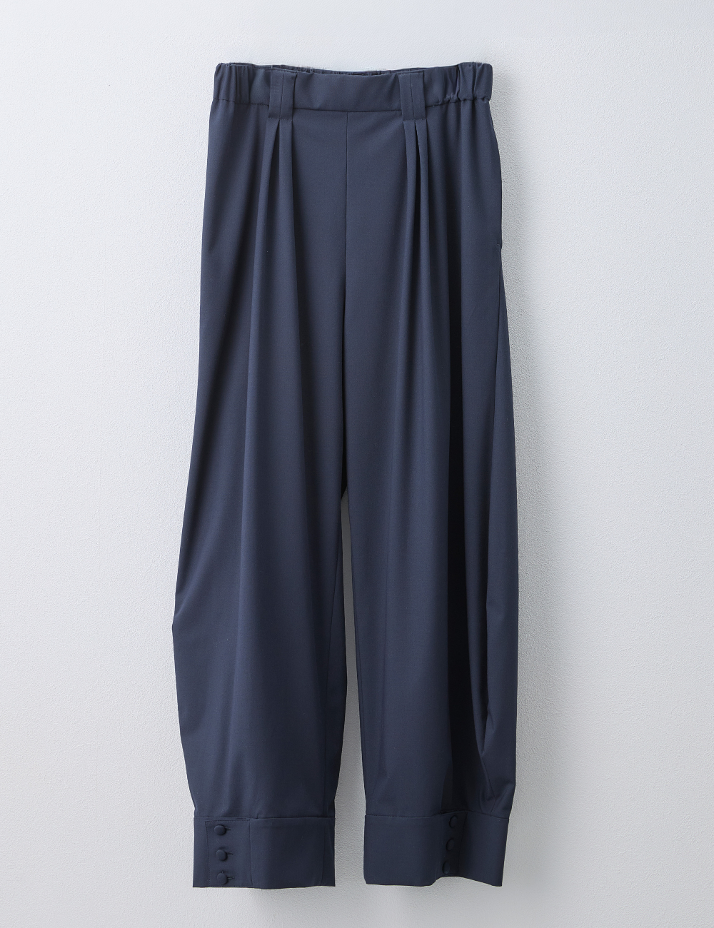 裾ボタンで2wayシルエットが楽しめる、シワになりにくいウールライク素材。