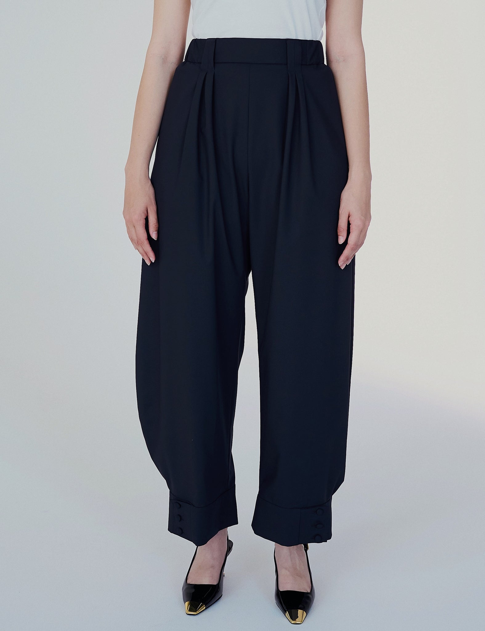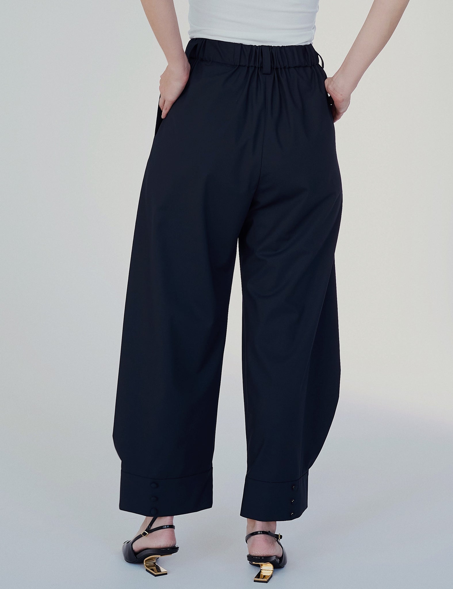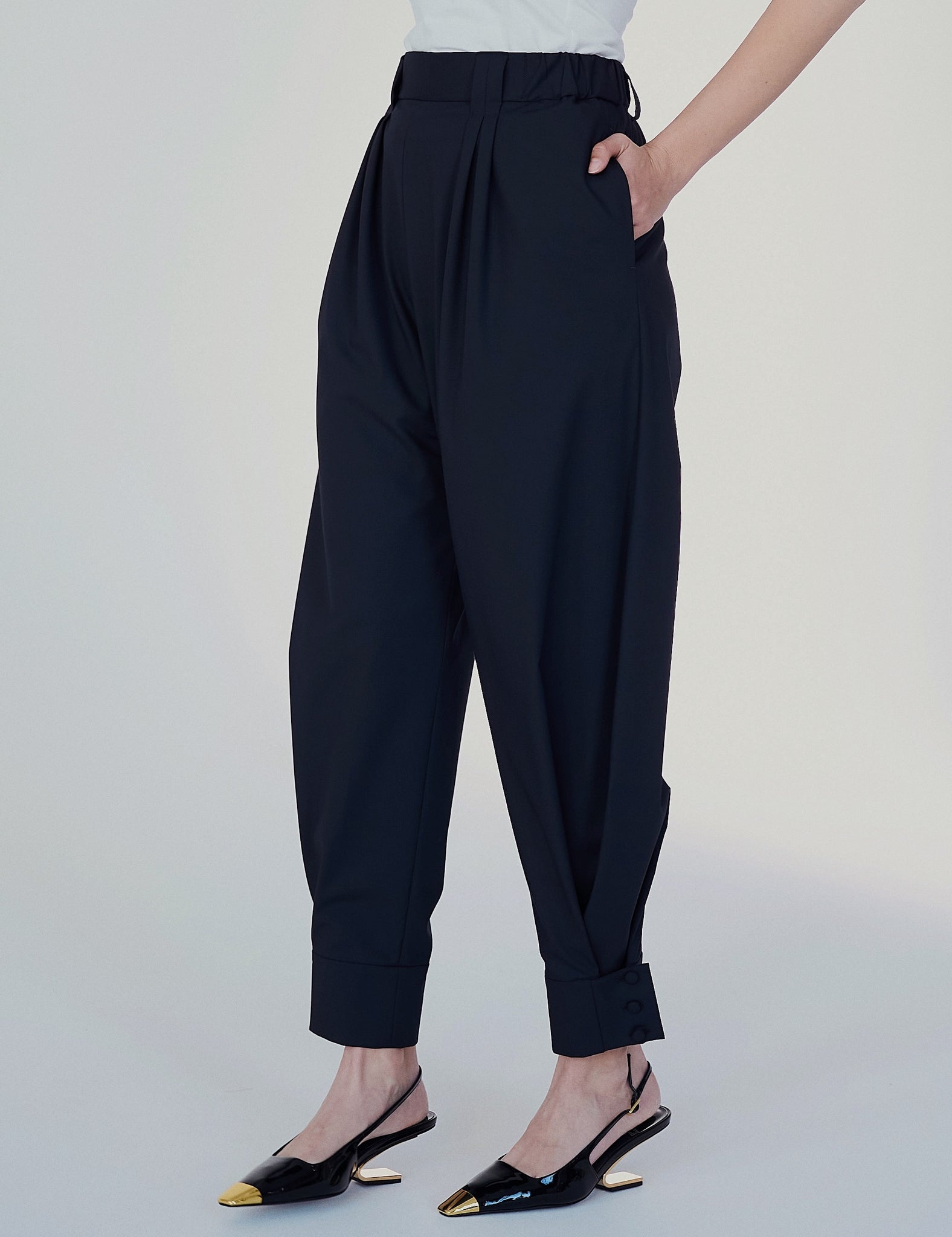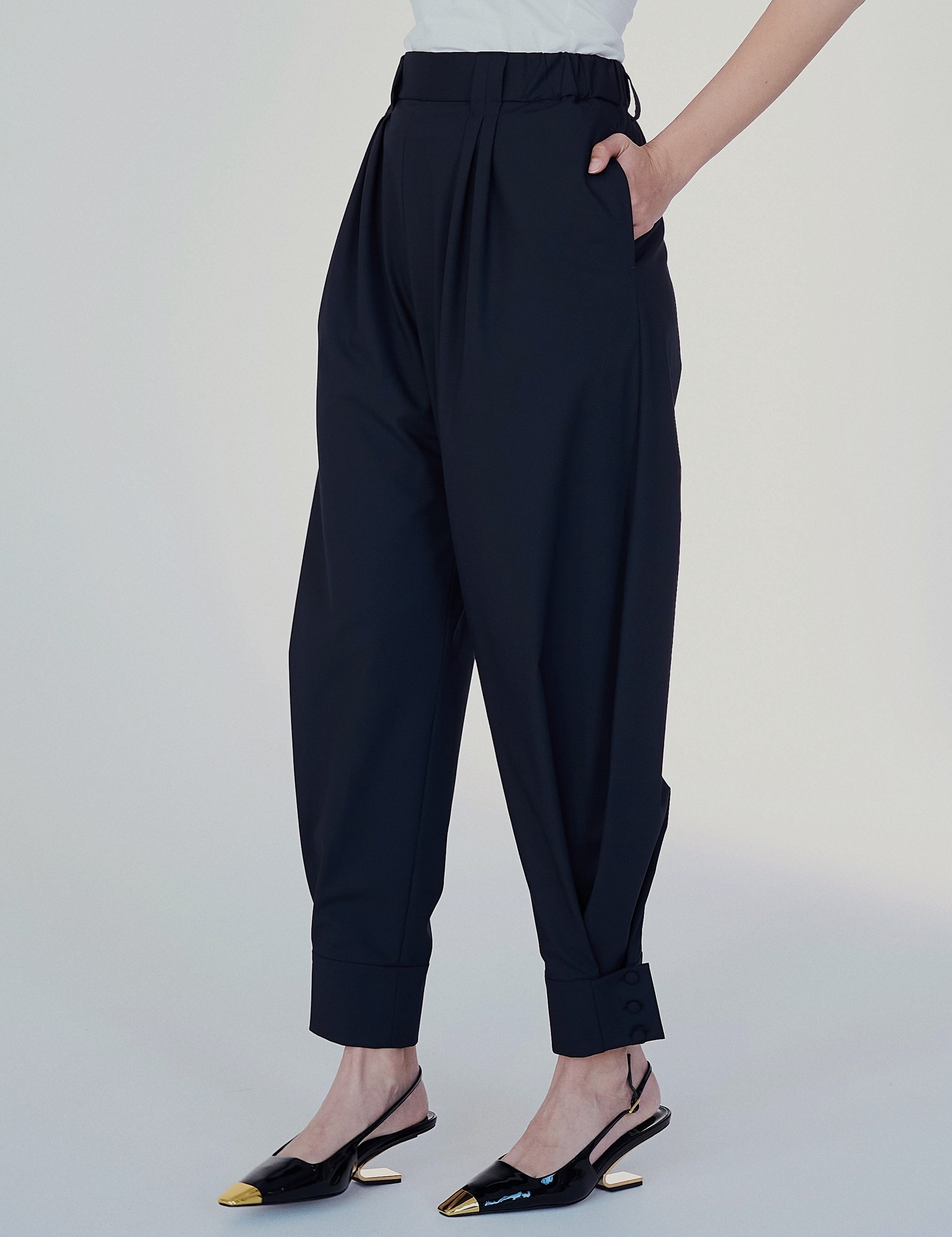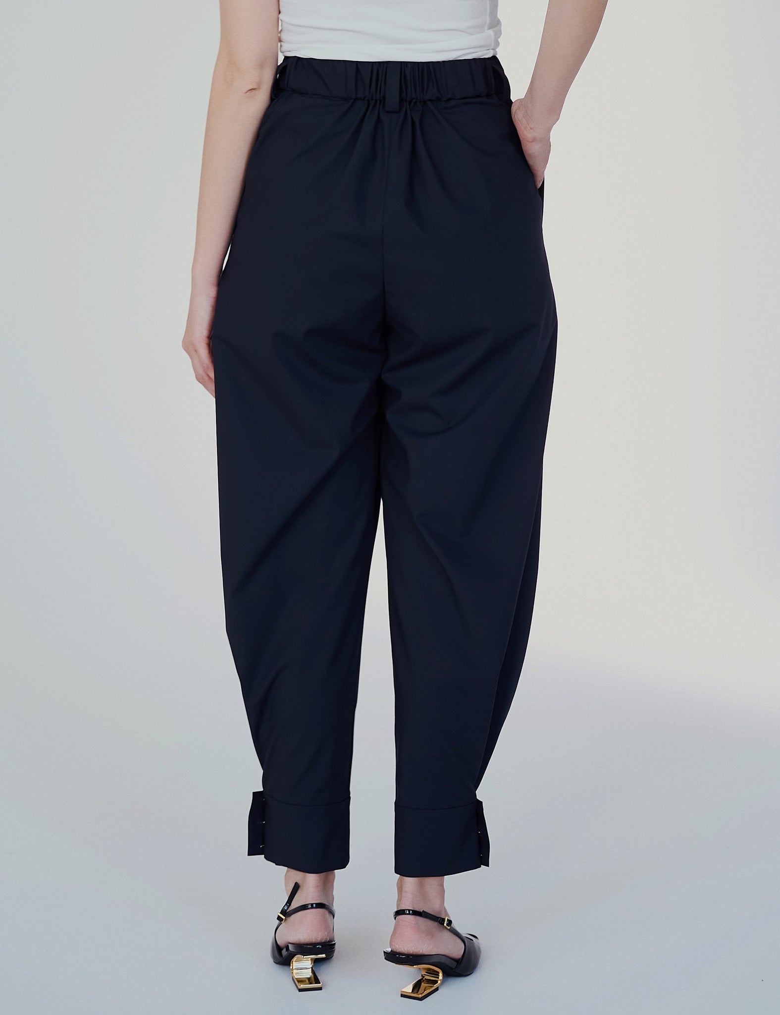 シューズ次第で雰囲気が変わるコクーンパンツ。